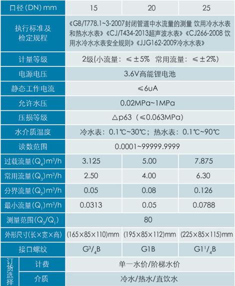 產(chǎn)品概述: 本產(chǎn)品符合GB/T778-2007《封閉滿管道中水流量的測(cè)量 飲用冷水水表和熱水水表》和《CJ/T434-2013超聲-波水表》標(biāo)準(zhǔn)。適用環(huán)境:戶內(nèi)安裝、樓道管道井安裝。功能特點(diǎn):●無(wú)機(jī)械運(yùn)動(dòng)部件,無(wú)磨損,使用壽命長(zhǎng);●始動(dòng)流量低,滴水計(jì)量,量程比R=250;●可更換電池設(shè)計(jì),無(wú)需從管道拆卸水表;●防護(hù)等級(jí)達(dá)到IP68,可長(zhǎng)期浸水工作;●采用微功耗技術(shù),電池供電可≥10年;●安裝多角度,管道壓力損失降到更低;●高度智能化的自檢能力,監(jiān)測(cè)空管、氣泡、換能器老化、電池欠壓等常見(jiàn)問(wèn)題; ●支持多種接口(M-Bus接口、RS-485接口、Rf射頻功能、物聯(lián)網(wǎng))。