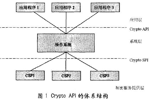 2.1智能卡與PC/SC規(guī)范 智能卡是一張內(nèi)含嵌入式集成電路芯片的信用卡般大小的塑料卡,具有儲存信息量大,數(shù)據(jù)保密性好,抗干擾能力強,儲存可靠,讀寫設備簡單,使用靈活,操作速度快,脫機工作能力強,易于攜帶等特點。本系統(tǒng)所使用的智能卡是一張?zhí)刂频膬?nèi)含有交換密鑰對,簽名密鑰對和證書用以提供加解密、認證等服務的電子卡。 PC/SC規(guī)范是一套為集成電路卡(ICC)與個人計算機系統(tǒng)設計進行交互的規(guī)范,能夠讓智能卡方便地訪問WindoW平臺。其主要優(yōu)點就是讓應用程序不必為了與智能卡通信而去了解智能卡讀卡器的細節(jié),應用程序通過PC/SC規(guī)范和智能卡讀卡器通信,后者再通過ISO7816與智能卡進行通信來獲取智能卡提供的服務,其傳輸?shù)陌Y(jié)構(gòu)是TPDU。 1.2 Crypto API體系結(jié)構(gòu)與CSP Crypto API是微軟提供的一套公共接口,包含了一系列的函數(shù),為應用程序提供加解密、數(shù)字簽名、哈希等安全服務,而應用程序不必關(guān)心其具體實現(xiàn)。不同的供應商可以開發(fā)獨立的加密模塊,這些模塊成為加密服務提供者(Cryptographic Service Provider CSP),完成密鑰生成/交換、加解密、數(shù)字簽名、認證等服務的真正模塊。微軟默認的CSP是RSA Based Provider,使用RSA公司的加密算法。一個系統(tǒng)中可以加載多個CSP模塊,它們相互獨立。應用程序可以使用任意一個CSP模塊,而不必關(guān)心它的具體實現(xiàn),每個CSP都對Crypto API進行不同的實現(xiàn)。 Crypto API的體系結(jié)構(gòu)如圖1所示。