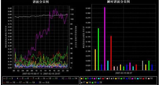 系統(tǒng)能監(jiān)測各通道多達(dá)50次諧波和50次間諧波含量、幅值、角度、功率等數(shù)據(jù),并進(jìn)行本地和數(shù)據(jù)庫存儲,隨時(shí)進(jìn)行調(diào)出以表格或曲線方式進(jìn)行分析。